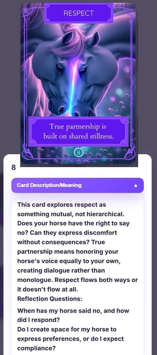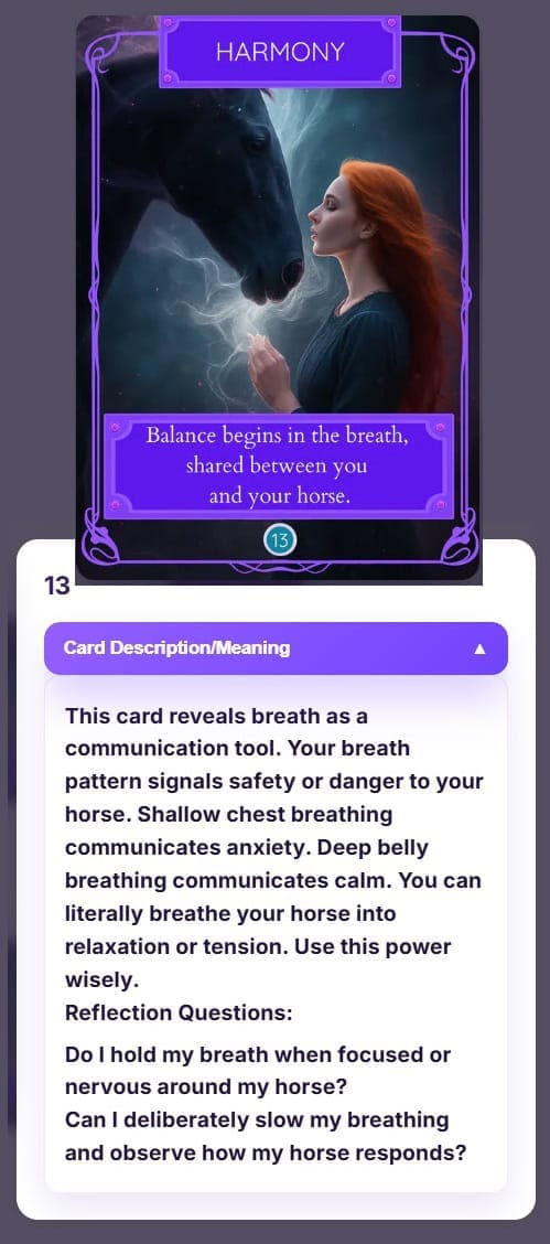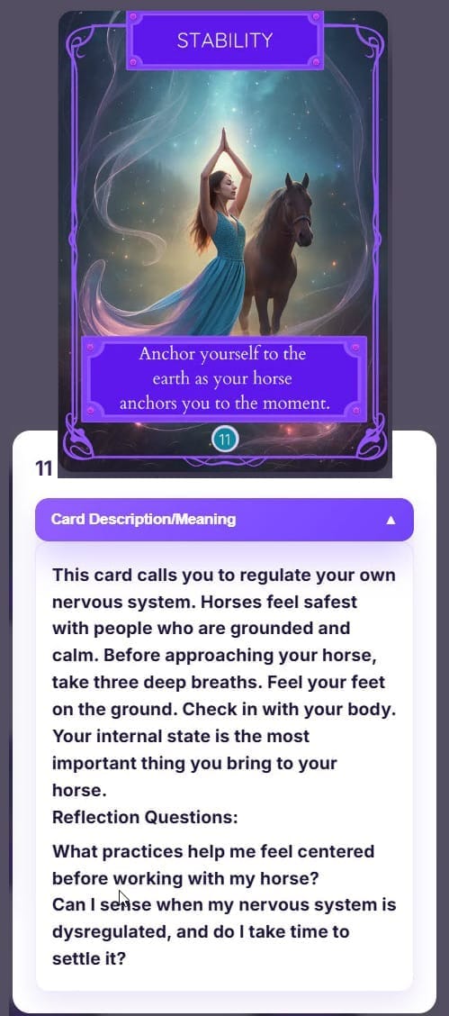 You’re not pulling a card at random. You’re using a simple tool to slow down and tune in to what you or your horse may be communicating to one another. Each message helps you notice subtle shifts in tension, mood, and response that are easy to miss when you’re focused on fixing or training.